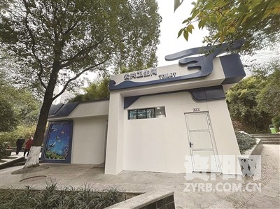 在九曲河广场一角,蓝白相间的公共厕所与郁郁葱葱的树木相映成趣。这个去年底新改造的公共厕所以“未来”为主题,在设计上利用色彩和线条体现了强烈的未来感。公厕建筑面积46. 9平方米,包括女厕5个蹲位、男厕4个蹲位和无障碍卫生间,能很好地满足广场游人使用需求。