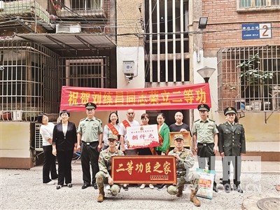 本报讯(全媒体记者 刘佳雨)5月8日,雁城土产公司家属楼内热闹非凡。伴随着喜庆热闹的锣鼓声,由雁江区人武部、雁江区退役军人事务局、雁江区莲花街道办事处等部门(单位)相关负责人组成的慰问组,为荣立二等功的现役军人刘练昌家庭送去喜报。