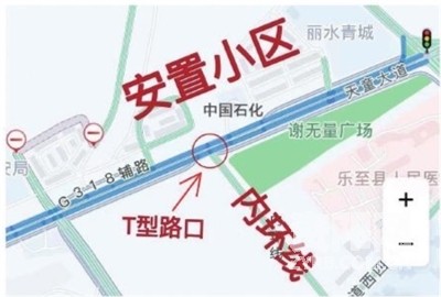 天童大道全长37.7公里,是一条双向八车道的主干道,限速60公里/小时。网友反映的T型路口位于该路段的中间位置,与内环线交会。天童大道一侧是成片的安置小区,靠内环线一侧的是谢无量广场以及正在施工的乐至县人民医院和体育馆,而距此T型路口最近的红绿灯和斑马线有1公里。