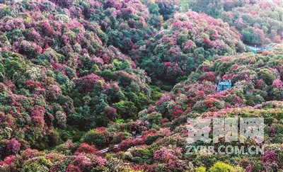 4月13日,游客在贵州省毕节市百里杜鹃管理区金坡景区观景赏花(无人机照片)。
