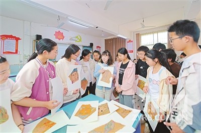 “颜色不用上得很均匀,安岳石刻历经沧桑,颜色是斑驳、淡雅的。”在这堂《藏在身边的美学密码——安岳石刻的线条与色彩》美术课上,邓艳春指导30名初一学生用一支黑色的勾线笔,画出他们眼中的石窟之美,再用油画棒装点上色彩。