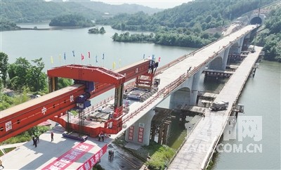 5月7日,在成渝中线高铁玄天湖双线大桥建设现场,架梁机在架设最后一孔箱梁(无人机照片)。玄天湖双线大桥位于重庆市铜梁区玄天湖4A级景区内。